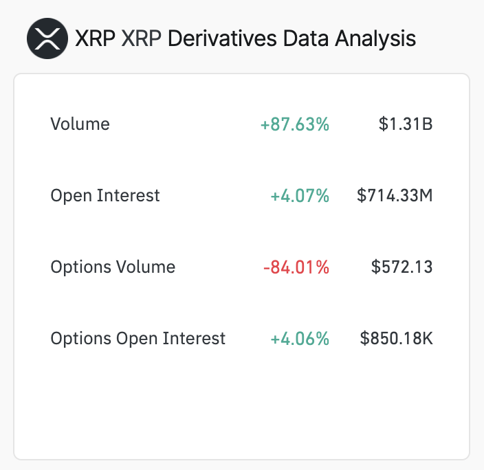 Inoltre, BeinCrypto ha notato un bias positivo nel mercato dei derivati XRP. Secondo Coinglass, il volume di trading nel mercato dei futures e delle opzioni XRP è aumentato dell’88% nelle ultime 24 ore.