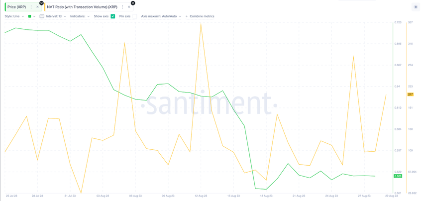 Come mostrato di seguito, il rapporto tra il valore della rete XRP e il volume delle transazioni (NVT) ha continuato a crescere dall’inizio di agosto. Al 29 agosto si trova attualmente a 217, con un aumento del 400% rispetto ai 51,85 registrati al minimo locale il 18 agosto.