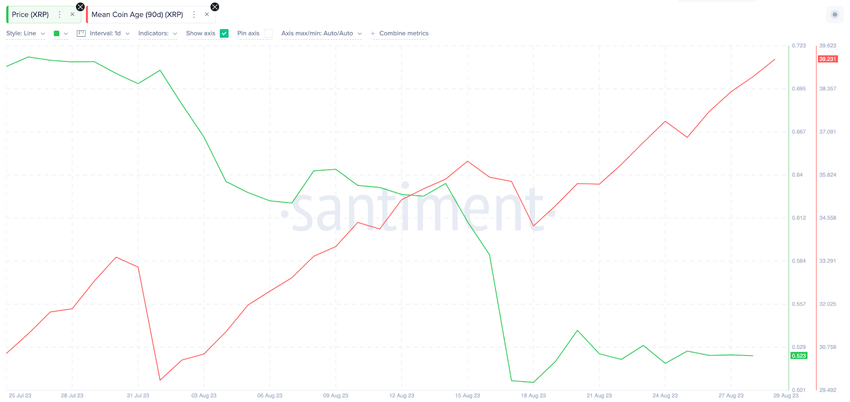 Anche se in misura diversa, il grafico sottostante illustra che le correzioni di prezzo di XRP più evidenti del 1° agosto, del 16 agosto e del 25 agosto sono state precedute da un calo significativo dell’età media della moneta.
