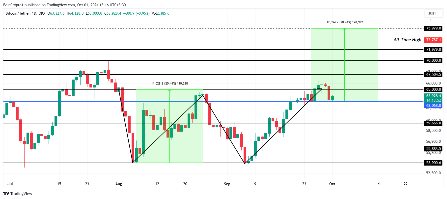 L’azione recente del prezzo di Bitcoin ha scatenato discussioni sulla possibilità di superare il suo massimo storico di 73.780 USD. La formazione di un pattern rialzista a doppio fondo suggerisce che superare questo livello è possibile.