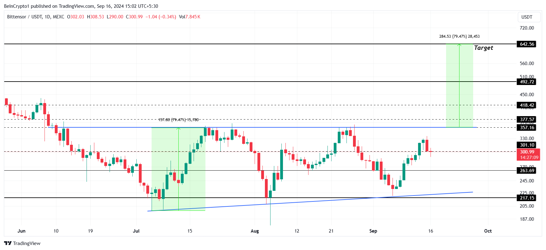Il prezzo di TAO è attualmente a 300 USD, leggermente sotto il livello cruciale di 301 USD. Se l’altcoin può trasformare questo livello in supporto, potrebbe salire verso 357 USD e uscire dal suo modello di triangolo ascendente rialzista. Raggiungere questo obiettivo preparerebbe il terreno per ulteriori guadagni e validerebbe lo scenario rialzista.