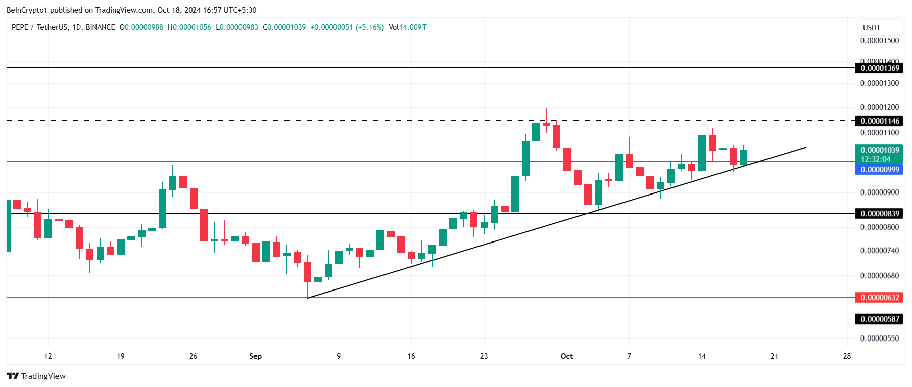 Nonostante lo slancio bullish indicato dall’RSI, i segnali contrastanti da altri indicatori potrebbero mantenere PEPE sotto il segno di 0,00001146 USD. La moneta ha stabilito una linea di tendenza rialzista come supporto, ma se perde questo livello, PEPE potrebbe scendere a 0,00000839 USD. Questo rappresenterebbe una correzione significativa, invertendo alcuni dei suoi recenti guadagni.