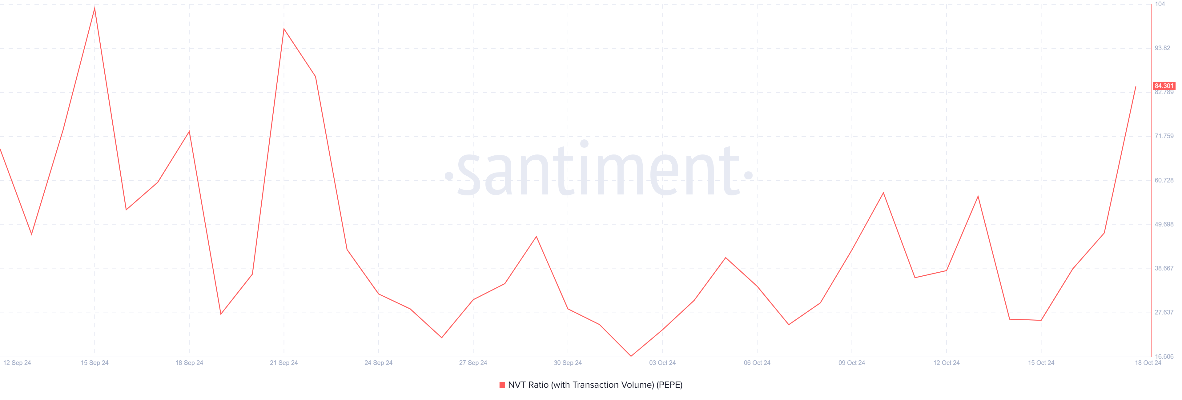 Uno degli indicatori più preoccupanti per PEPE è l’aumento del rapporto NVT (Network Value to Transactions), che ha raggiunto un massimo di quattro settimane. Un rapporto NVT elevato suggerisce tipicamente che la rete è sopravvalutata rispetto al numero di transazioni in corso.