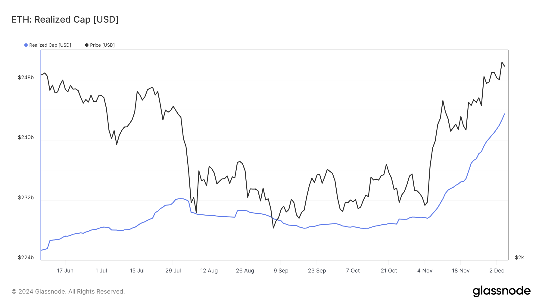 Ethereum Realized Cap, che ha affrontato un notevole calo tra agosto e novembre, ha raggiunto un nuovo massimo storico di 243,45 miliardi USD, secondo i dati di Glassnode. Questo sviluppo avviene mentre il prezzo di ETH sale a 3.800 USD.
