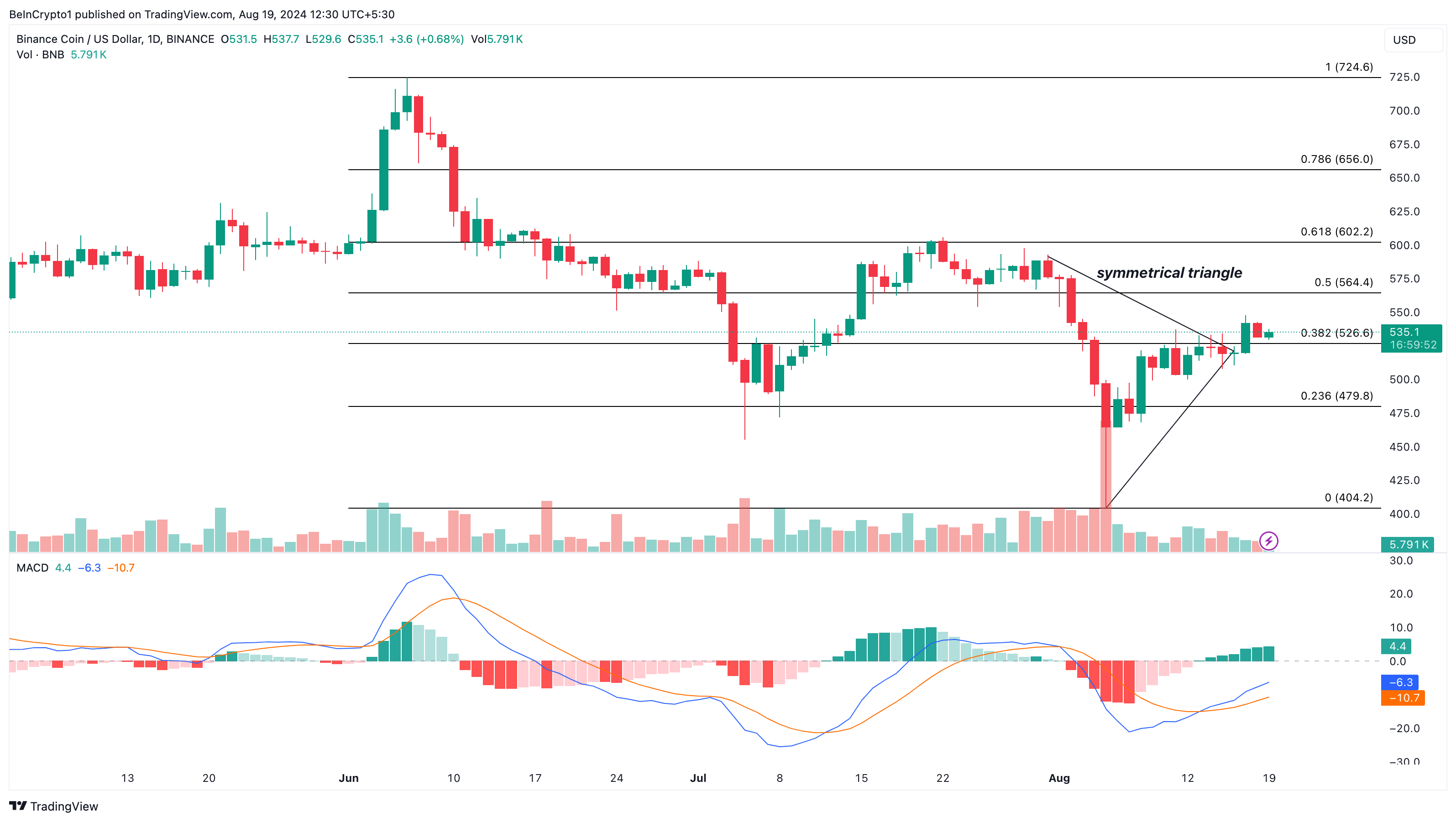 I triangoli simmetrici possono indicare entrambe le direzioni; la rottura al di sotto della linea di tendenza inferiore conferma il ribasso, mentre una rottura al di sopra della linea di tendenza superiore suggerisce un rialzo. Nel caso di BNB, il movimento al rialzo suggerisce che i rialzisti stanno puntando alla prossima resistenza a 564,40 dollari.