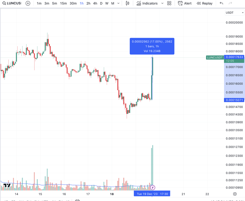 Dopo la diffusione della notizia, il prezzo di Terra Luna Classic (LUNC) ha subito un’impennata di ben il 17%.
