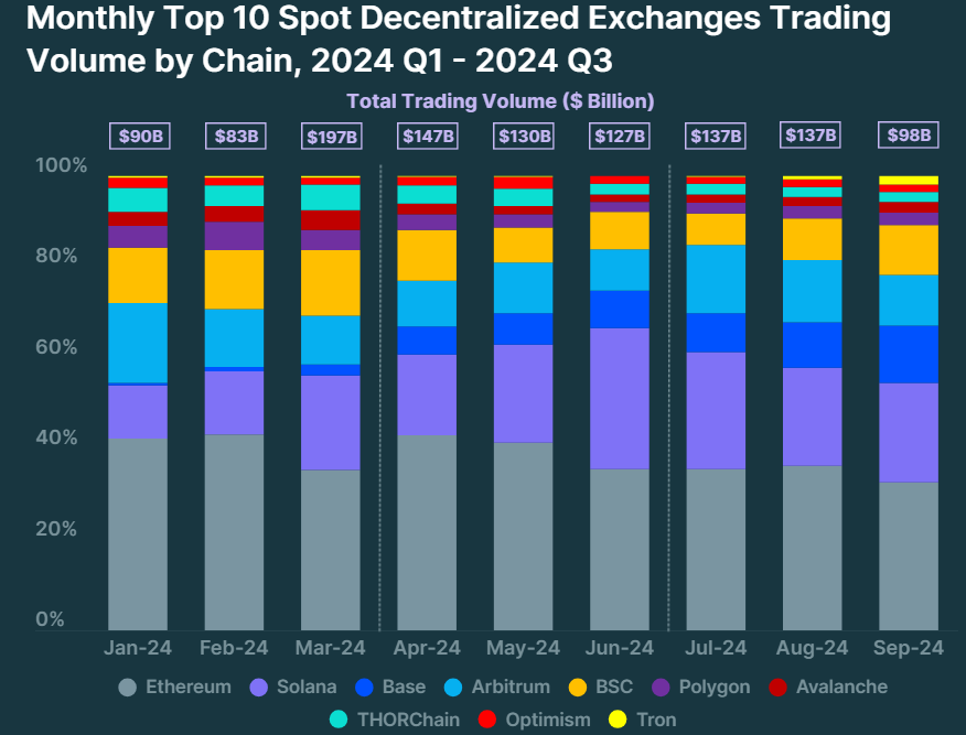 “L’attività di trading sui DEX è continuata a prosperare su Solana, sostenuta dalla moltitudine di memecoin. Ha chiuso settembre con una quota di mercato del 22% e un volume di 21,5 miliardi USD,” ha detto CoinGecko.