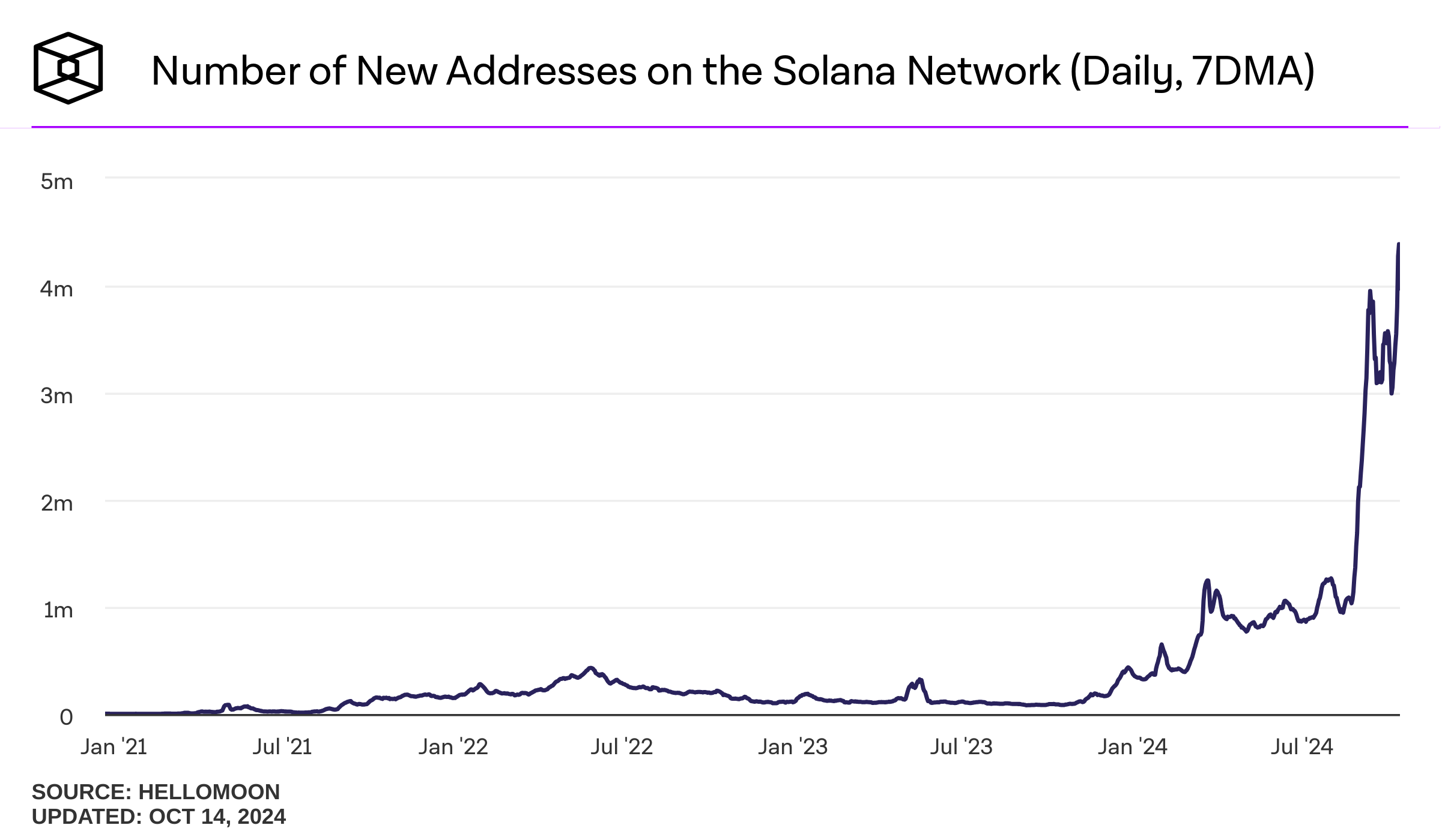 I dati di IntoTheBlock rivelano che gli indirizzi attivi giornalieri (DAA) della rete Solana hanno raggiunto un nuovo record. A ottobre, la rete di Solana ha visto oltre 4 milioni di indirizzi attivi in certi giorni. Da settembre, il DAA è rimasto costantemente sopra i 3 milioni al giorno.