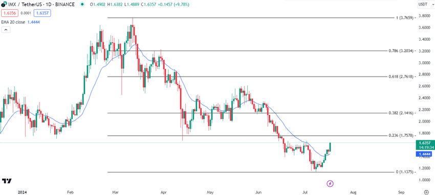 IMX è pronto a continuare il suo trend rialzista, avendo recentemente superato la sua media mobile esponenziale (EMA) a 20 giorni.