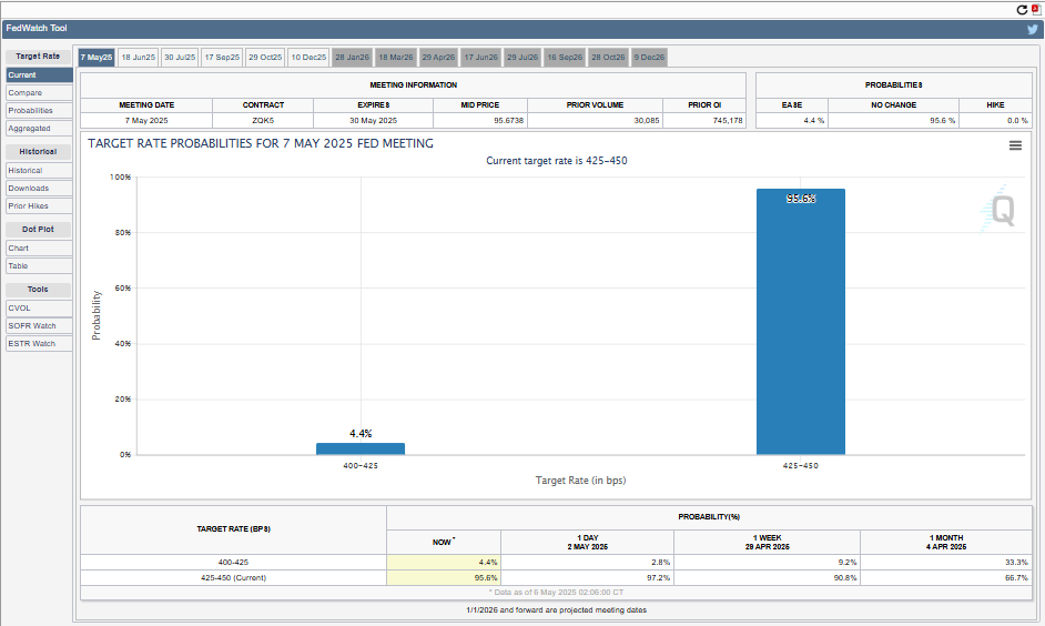 Secondo i dati del CME FedWatch Tool, i partecipanti al mercato assegnano una probabilità del 95,6% che la Fed mantenga i tassi stabili al 4,25% – 4,5%. Con questo, l’attenzione è ora completamente focalizzata sul tono e le indicazioni del Presidente della Fed Jerome Powell alla conferenza di mercoledì.