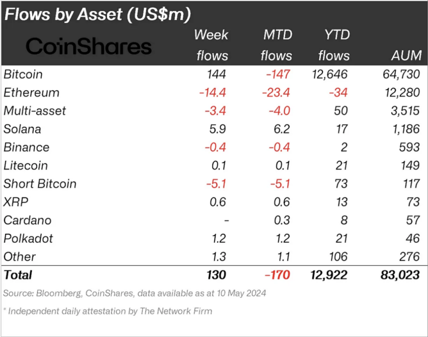 Questa ripresa dell’attività di investimento è in gran parte attribuita agli afflussi di Bitcoin, che la scorsa settimana hanno raccolto circa 144 milioni di dollari. Ciò è in linea con le tendenze di mercato più ampie, suggerendo una rinnovata fiducia tra gli investitori nonostante le sfide in corso.