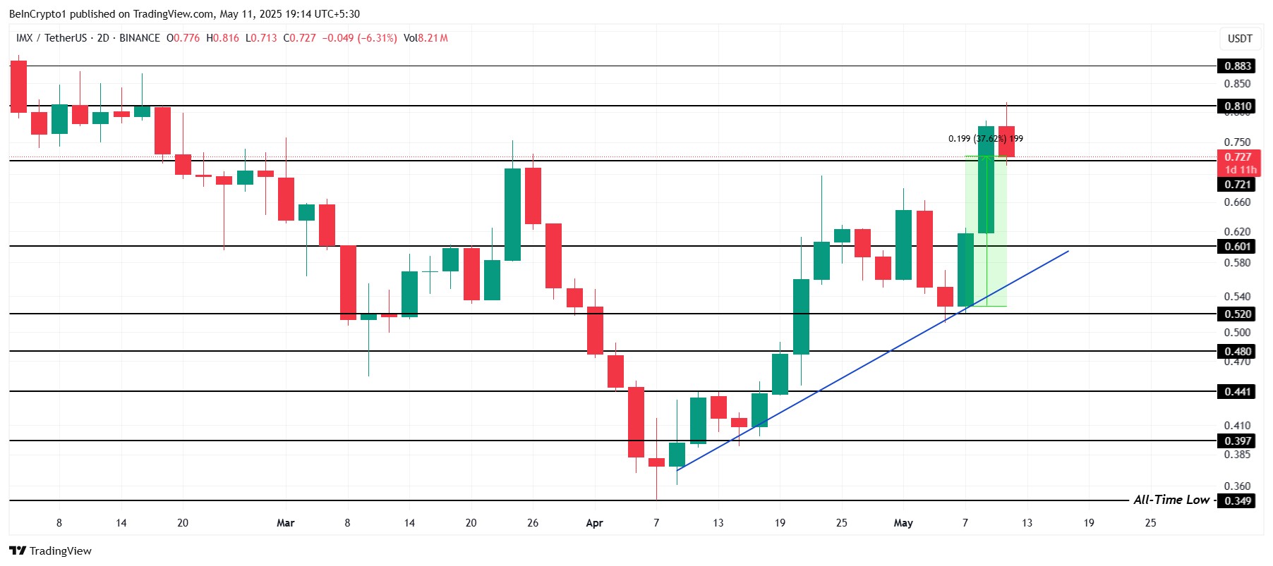 D’altra parte, se il sentimento degli investitori rimane rialzista e i segnali del mercato più ampio continuano a supportare il rally, IMX potrebbe superare la resistenza di $0,81.