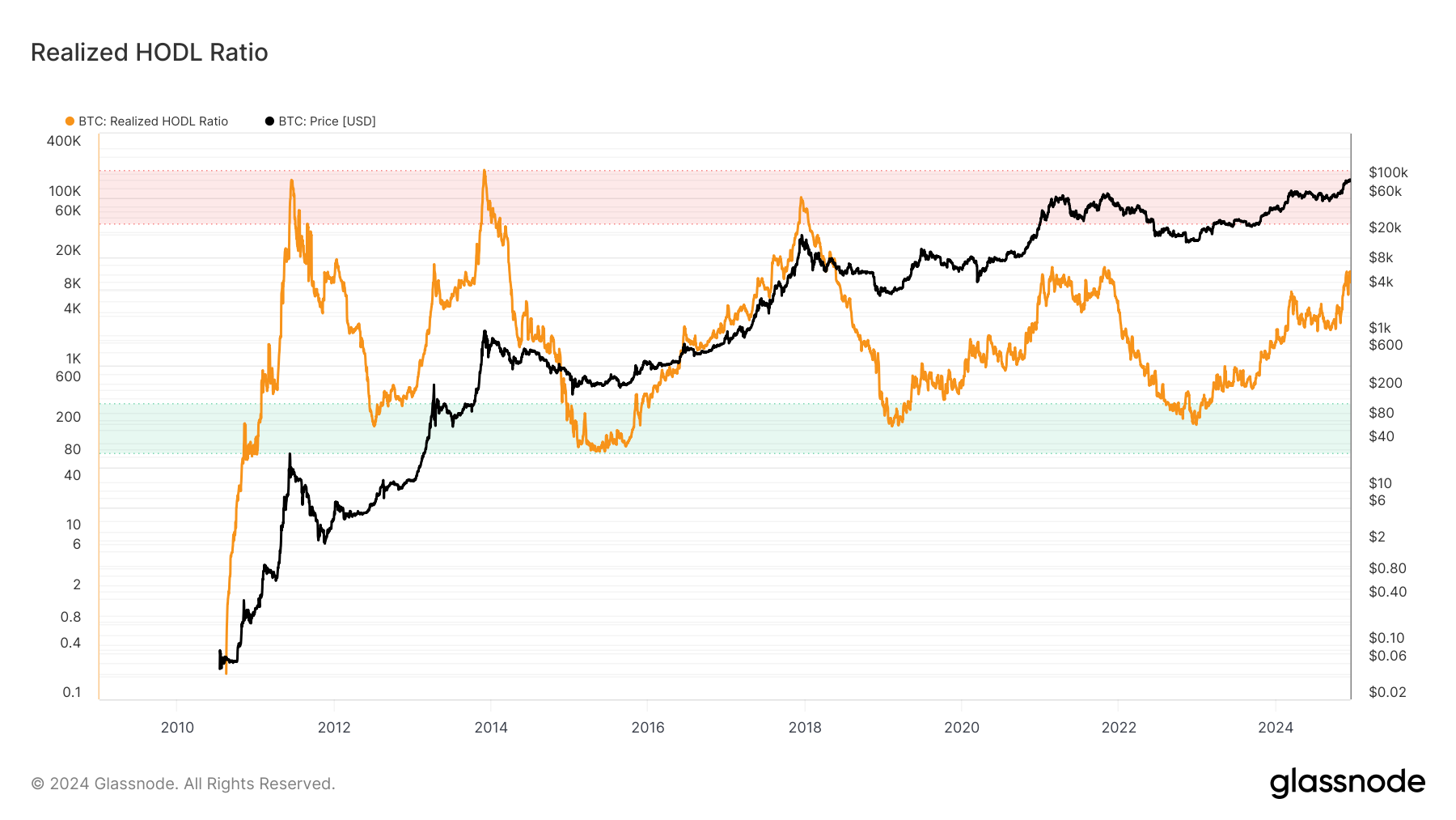 Un alto rapporto RHODL suggerisce che il mercato è surriscaldato con un’attività significativa a breve termine, spesso utilizzato per segnalare i picchi di ciclo o le correzioni imminenti. Un basso rapporto RHODL, d’altra parte, indica un forte sentimento di detenzione a lungo termine, implicando una sottovalutazione.