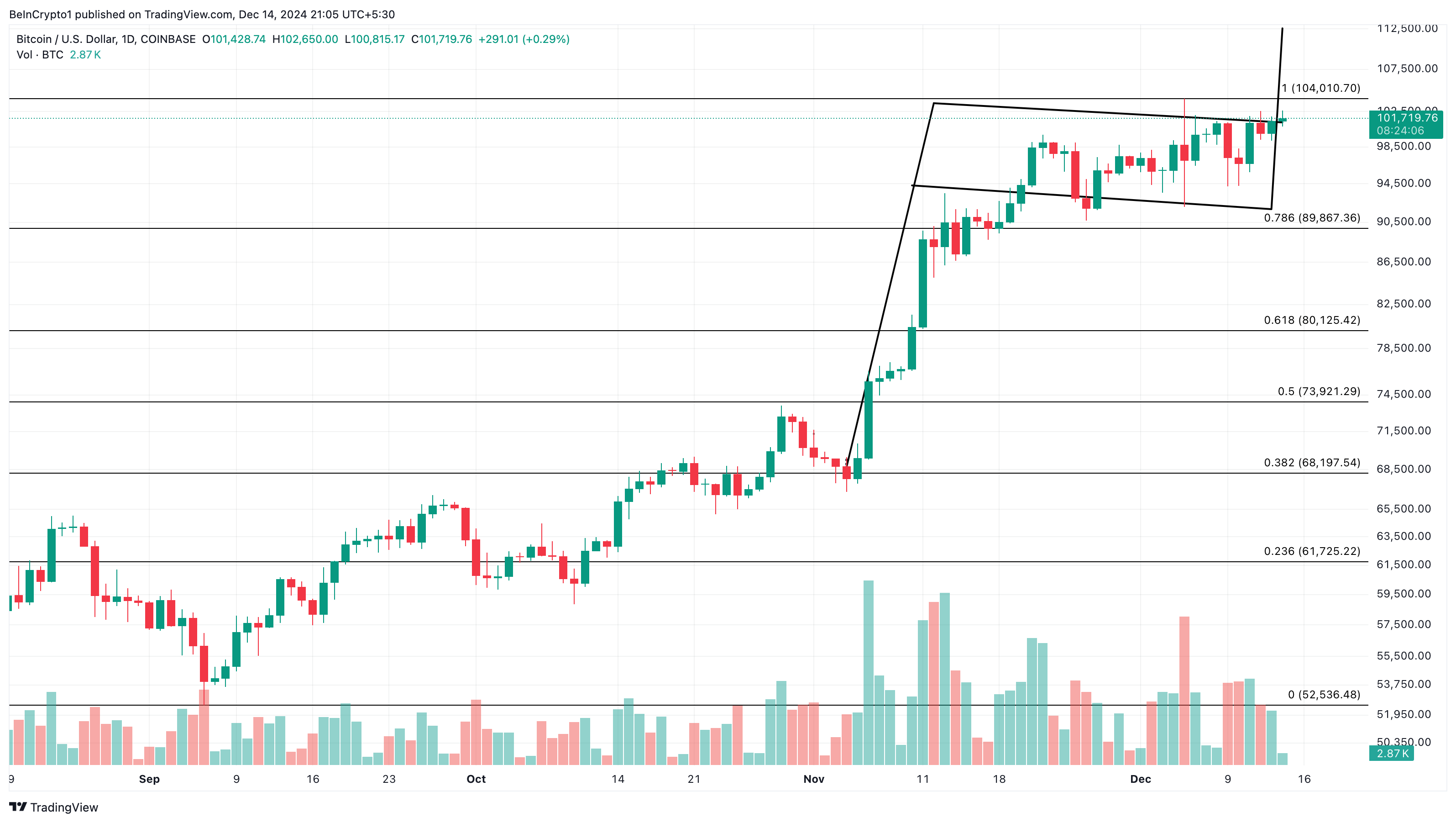 Bitcoin sembra aver superato il limite superiore della bandiera. Con questa posizione, il valore della criptovaluta potrebbe salire a 112.500 USD.