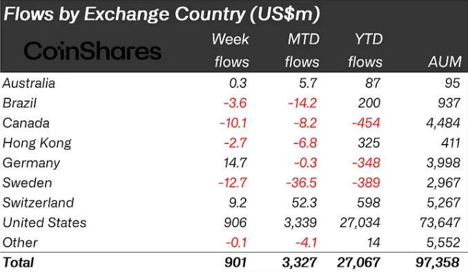 L’interesse crescente evidenzia l’entusiasmo intorno agli investimenti in criptovalute mentre il ciclo elettorale negli USA si intensifica. Specificamente, la maggior parte degli afflussi di questo mese, pari a 906 milioni di USD, proviene dagli USA, creando una netta disparità rispetto ad altre regioni.