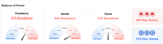 L’interesse intensificato per le criptovalute è correlato ai recenti cambiamenti nei sondaggi a favore dei Repubblicani. Gli stati in bilico, storicamente cruciali nel determinare i risultati delle elezioni, hanno influenzato anche il sentimento degli investitori. Secondo i dati del mercato delle previsioni Polymarket, i Repubblicani mostrano forza in diversi di questi stati chiave sulle metriche di equilibrio di potere, il che potrebbe ulteriormente amplificare gli afflussi di investimenti in cripto se questa tendenza continua.