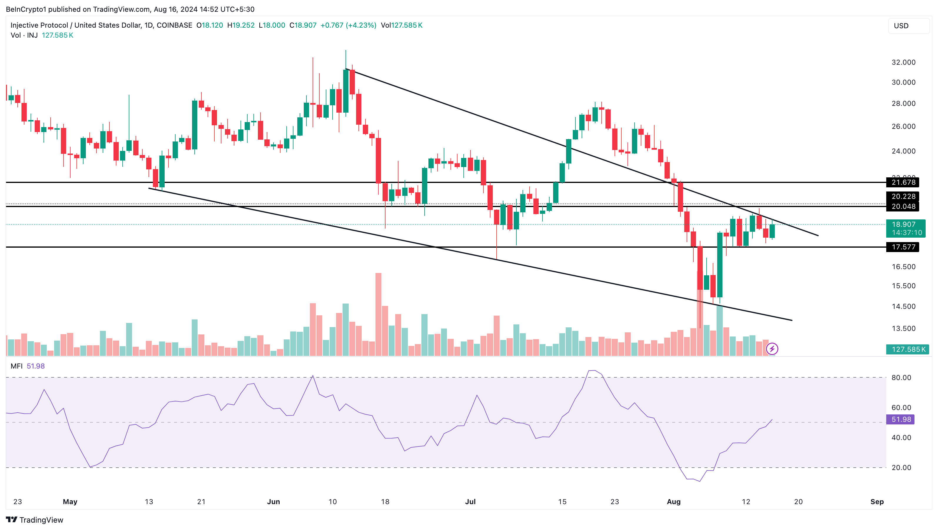 Sulla base del grafico giornaliero, INJ ha formato un cuneo discendente. Questo modello rialzista appare quando una tendenza al ribasso perde slancio e gli acquirenti capitalizzano l’esaurimento per accumulare più token.
