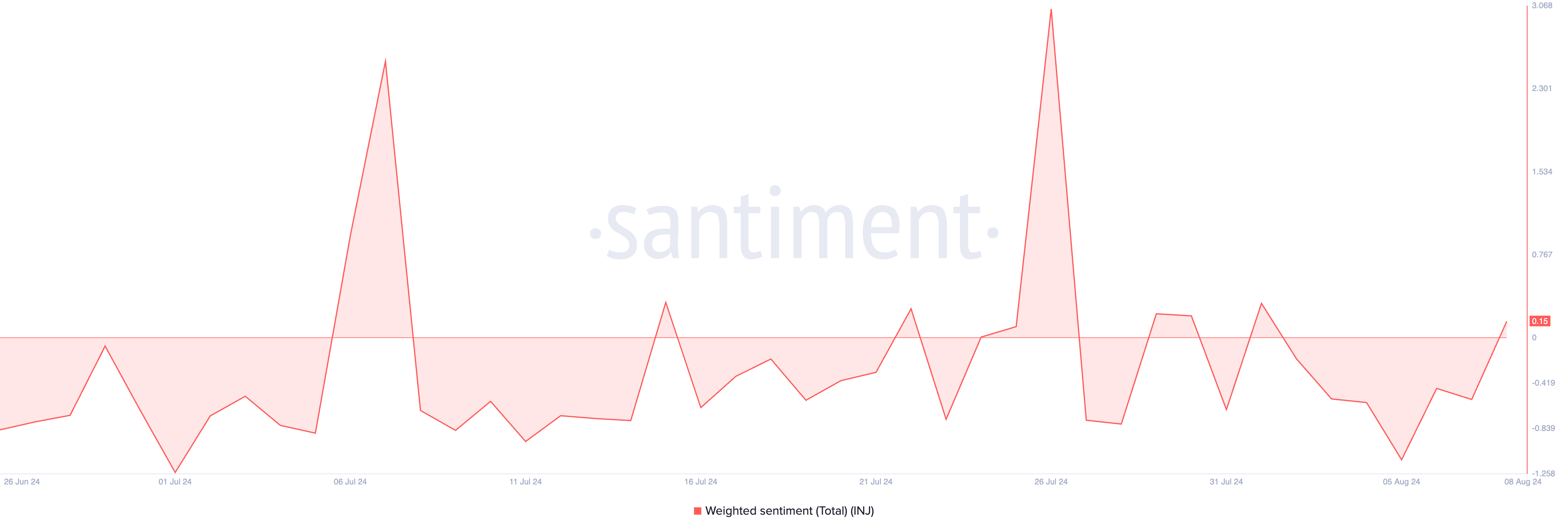 Il cambiamento positivo nelle tendenze del mercato può essere dedotto anche dal sentiment ponderato di INJ. La metrica sul blockchain ha riportato un valore positivo per la prima volta dall’inizio di agosto. Al momento della stampa, il sentimento ponderato di INJ è pari a 0,15.