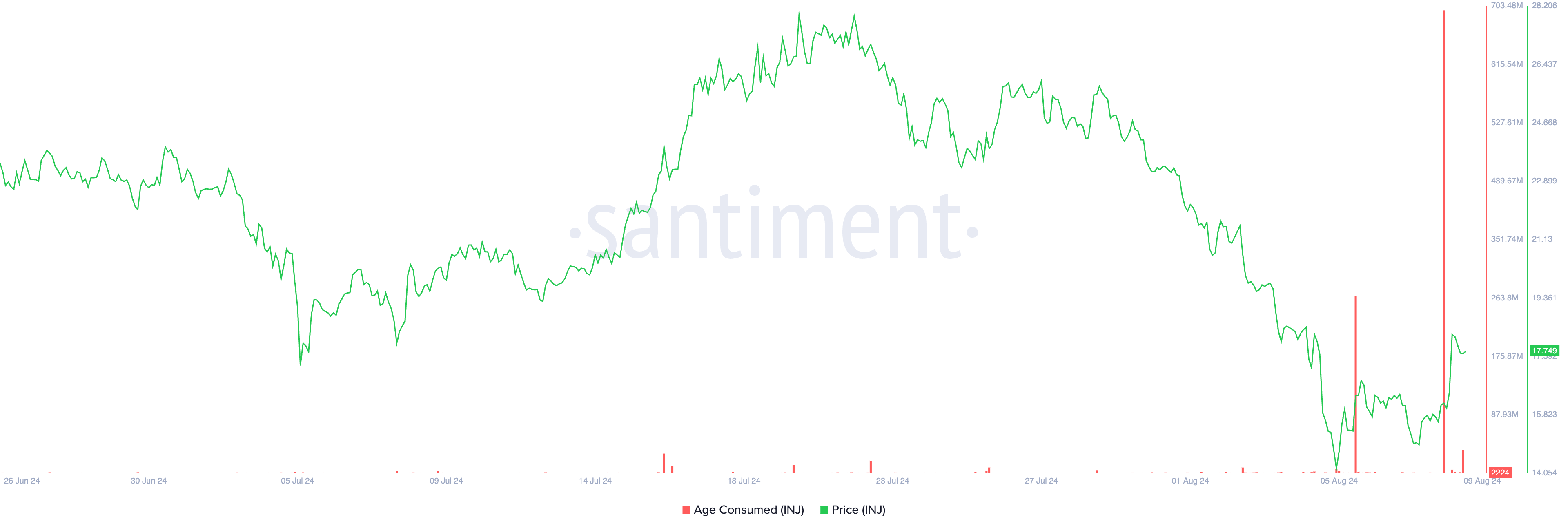 SponsoredGiovedì, l’età consumata di INJ è salita a 133.000, un livello che non si vedeva dal 12 giugno. L’impennata della metrica è stata seguita da un rialzo dei prezzi, indicando che il prezzo più basso prima del rally, 16,13 dollari, ha segnato un fondo locale. Attualmente scambia a 17,60 dollari, il prezzo di INJ è aumentato del 9%.