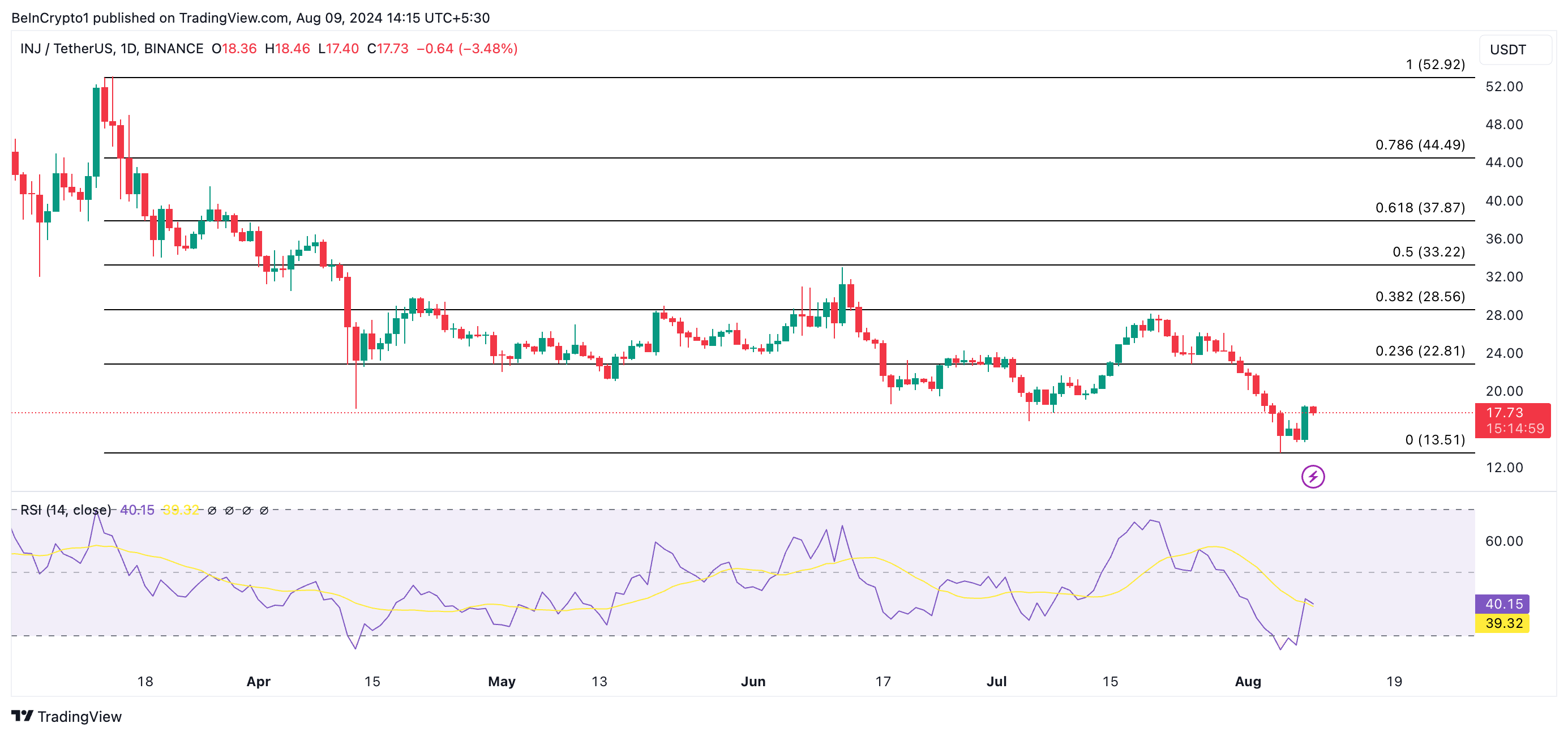 BeInCrypto ha riportato in precedenza che l’Indice di Forza Relativa (RSI) di INJ suggeriva che l’altcoin era ipervenduta e pronta per un rimbalzo. Questo rimbalzo sembra essere in corso, dato che l’aumento dell’RSI indica una crescente domanda per l’altcoin. Al momento della stampa, l’RSI di INJ ha una tendenza al rialzo a 40,10.