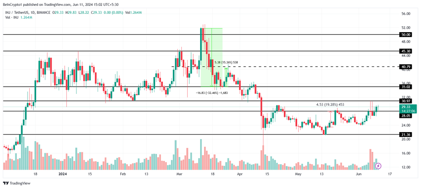 Ilprezzo di Injective, che scambia a 29,3 dollari, è vicino alla resistenza a 30,9 dollari, ma per superarla il rialzo dovrebbe continuare. Dato che l’altcoin è recentemente uscita dal consolidamento tra 28,0 e 21,3 dollari, ciò sembra possibile.