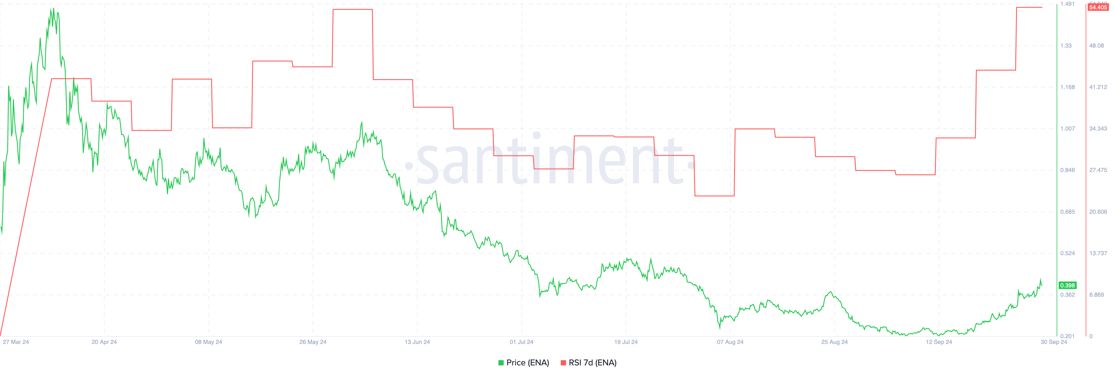 L’RSI a 7 giorni di ENA è attualmente a 54,40, in netto aumento rispetto a 26 solo 20 giorni fa, segnalando un forte momentum ascendente. L’RSI (Indice di Forza Relativa) è un indicatore di momentum popolare usato per valutare se un asset è ipercomprato o ipervenduto. Valori sotto 30 indicano condizioni di ipervenduto e sopra 70 suggeriscono territorio ipercomprato.