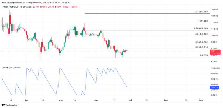 Il declino del prezzo di RNDR sembra perdere slancio e quindi potrebbe essere in corso un potenziale rimbalzo. Secondo le letture della Aroon Down Line del token, il suo valore è del 28,57% al momento in cui scriviamo.