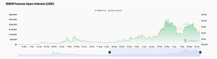 Al momento in cui scriviamo, l’open interest dei contratti a termine di RNDR è di 132 milioni di dollari. È sceso del 35% dall’inizio del mese.
