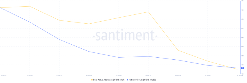 Si tratta di un segnale ribassista che indica una riduzione dell’attività di mercato e dell’interesse dei trader. La diminuzione dell’interesse è visibile nella diminuzione degli indirizzi attivi giornalieri di RNDR e nella nuova domanda di token.