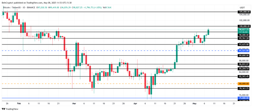 Il prezzo di Bitcoin è attualmente scambiato a $98.827 sul grafico giornaliero, appena sotto il livello di resistenza critico di $100.000, segnando un massimo di due mesi. Se il mercato continua a mostrare forza e la fiducia degli investitori rimane solida, Bitcoin potrebbe trasformare $100.000 in supporto, aprendo la strada a ulteriori guadagni.