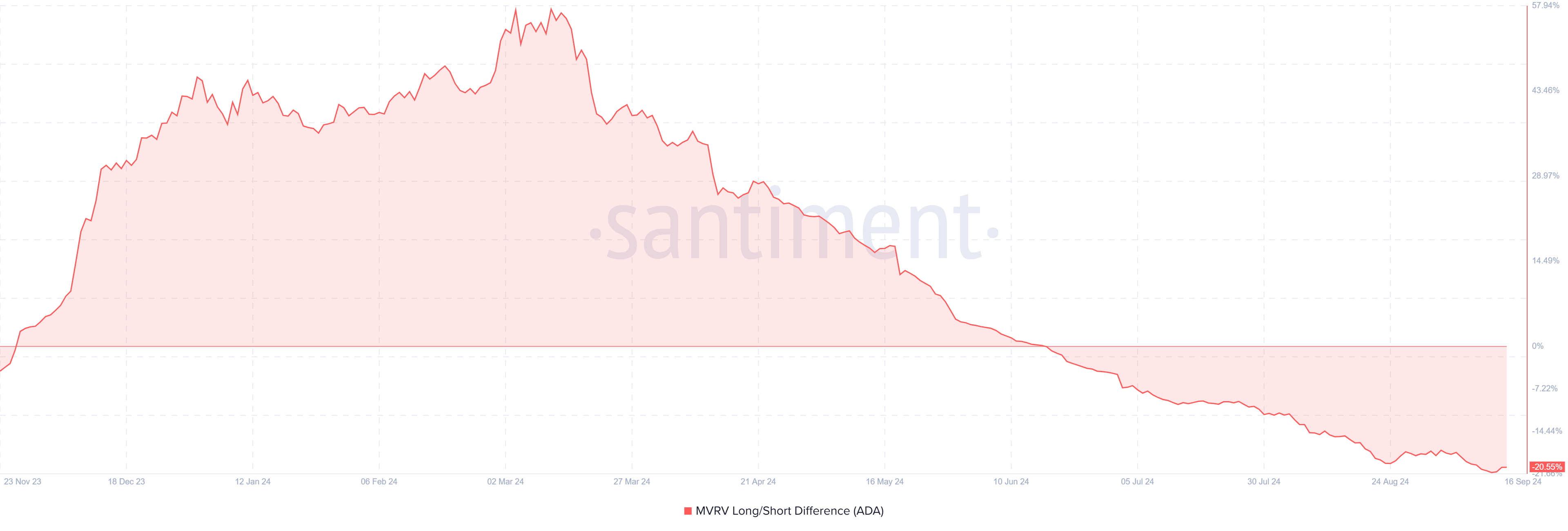 Il differenziale lungo/breve del Valore di Mercato al Valore Realizzato (MVRV) di Cardano mostra segnali ribassisti, attualmente a -20%. Questo indicatore valuta la possibilità di profitto per i detentori a lungo o breve termine.