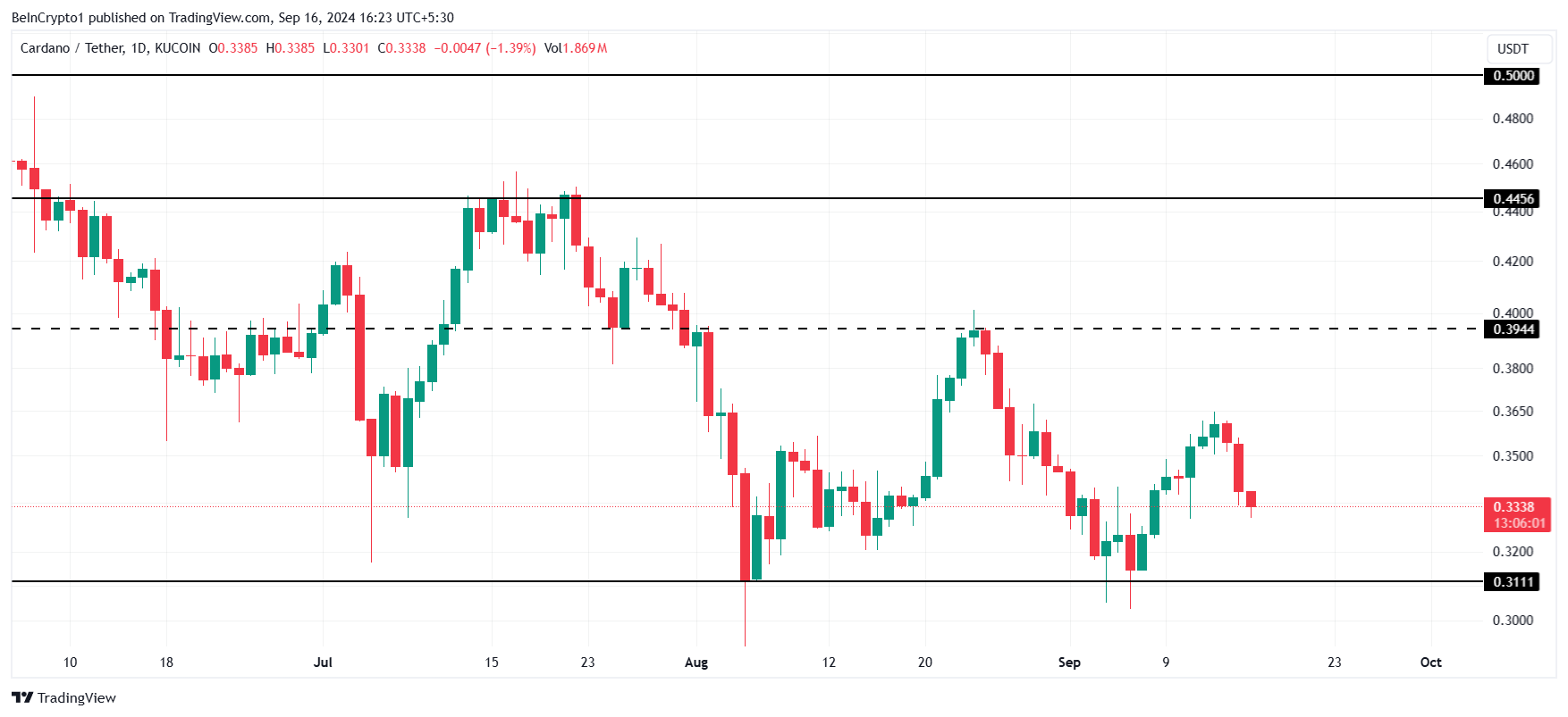 Cardano è attualmente scambiato a 0,33 USD, consolidandosi tra 0,31 USD e 0,39 USD. Questo intervallo ha impedito all’altcoin di emergere, e la consolidazione suggerisce che ADA difficilmente vedrà un significativo movimento ascendente a breve termine.