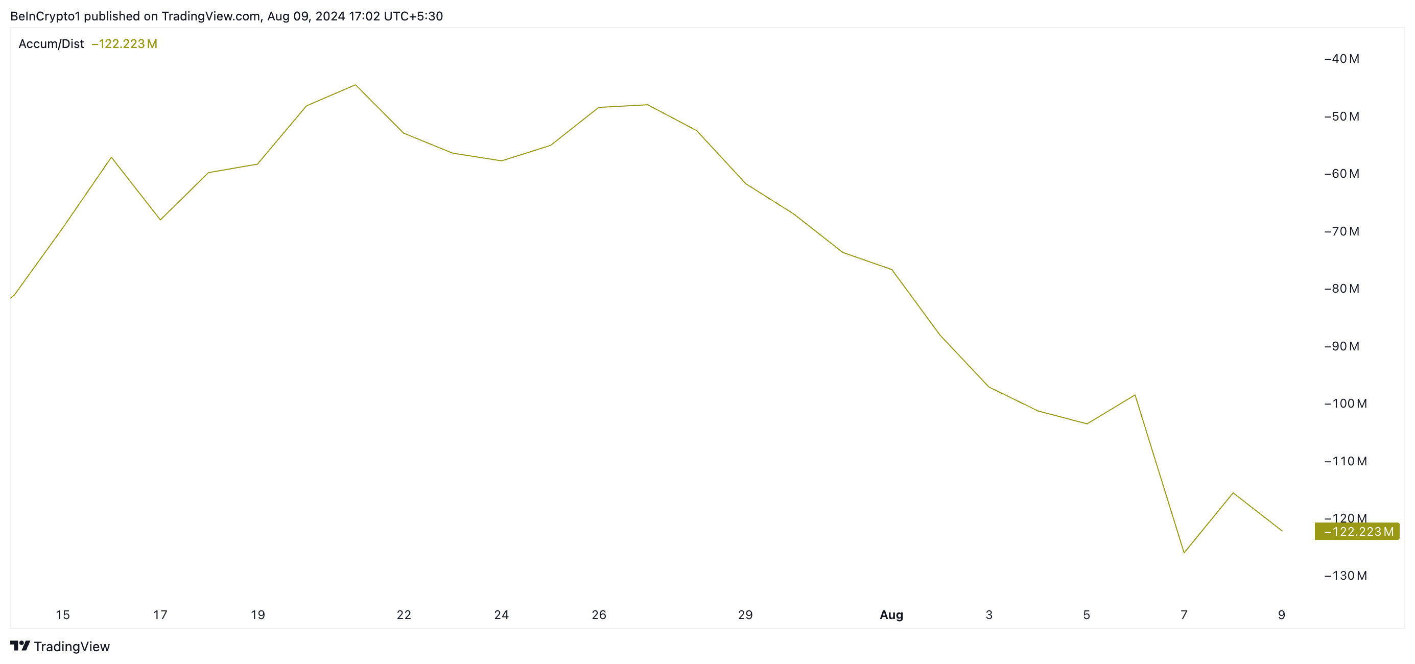 Questo indicatore traccia il flusso cumulativo di denaro in entrata e in uscita da un asset. Un calo della linea A/D rivela una maggiore distribuzione rispetto all’accumulo, suggerendo che la pressione di vendita sta prevalendo su quella di acquisto, facendo scendere il prezzo dell’asset.