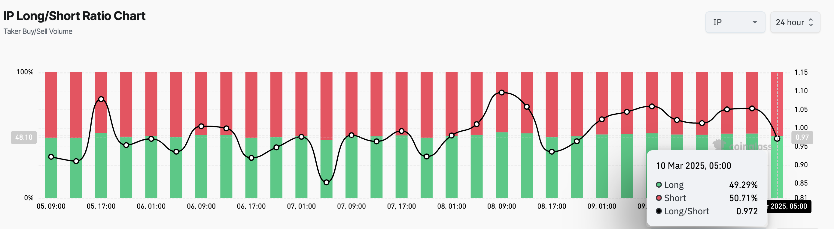 Nonostante l’attuale slancio rialzista, i dati del mercato dei futures rivelano che i trader di IP hanno aperto aggressivamente posizioni short contro di esso, come indicato dal suo rapporto long/short. Al momento della stampa, questo rapporto è inferiore a uno, a 0,97.