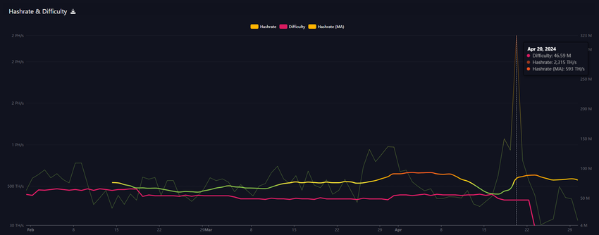 Le ripercussioni tecniche dell’attacco si sono chiaramente riflesse nei dati dell’hash rate della testnet della rete Bitcoin. I dati di mempool.space mostrano un picco a 2.315 terahash al secondo (TH/s) il 20 aprile prima di crollare di nuovo a 86 TH/s entro il 30 aprile.