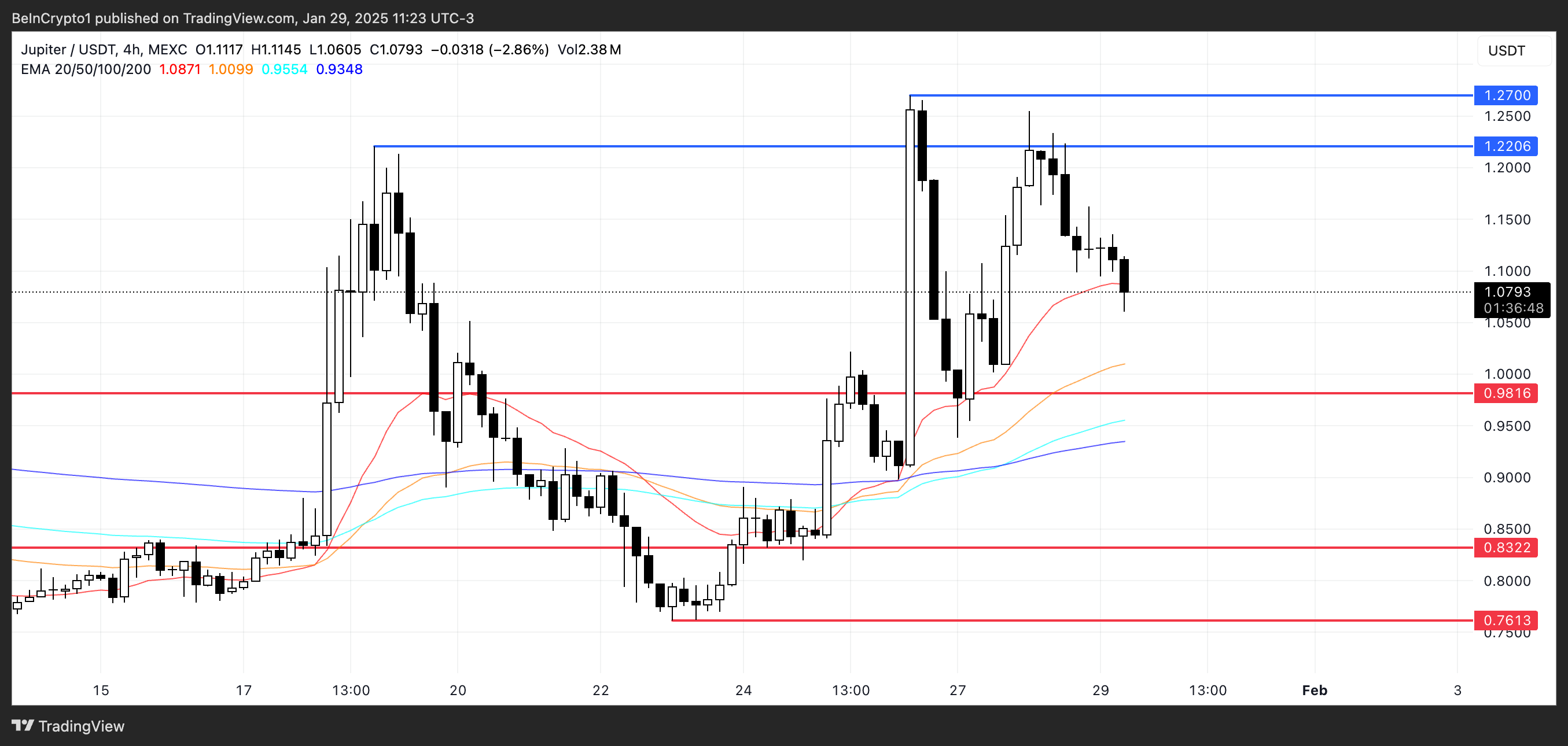 Jupiter le linee EMA rimangono rialziste, con le medie mobili a breve termine ancora posizionate sopra quelle a lungo termine. Tuttavia, se la correzione attuale continua, JUP potrebbe testare il livello di supporto chiave a 0.98 USD.