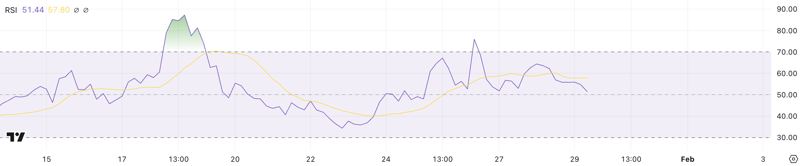 RSI (Relative Strength Index) misura il momentum, con valori sopra 70 che indicano condizioni di ipercomprato e sotto 30 che segnalano livelli di ipervenduto. L’RSI di JUP è ora a 51.44, il che significa che non è più in ipercomprato ma non ha raggiunto il territorio di ipervenduto.