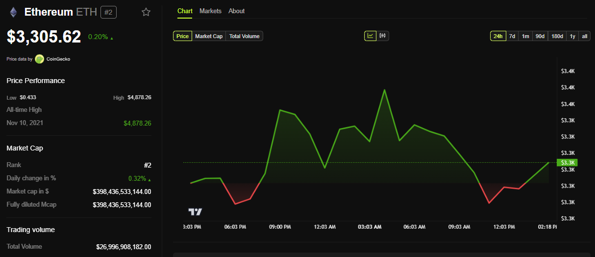 Il token ETH di Ethereum era scambiato a 3.305 USD al momento della scrittura, rappresentando un modesto aumento dello 0,2% dall’apertura della sessione di mercoledì.