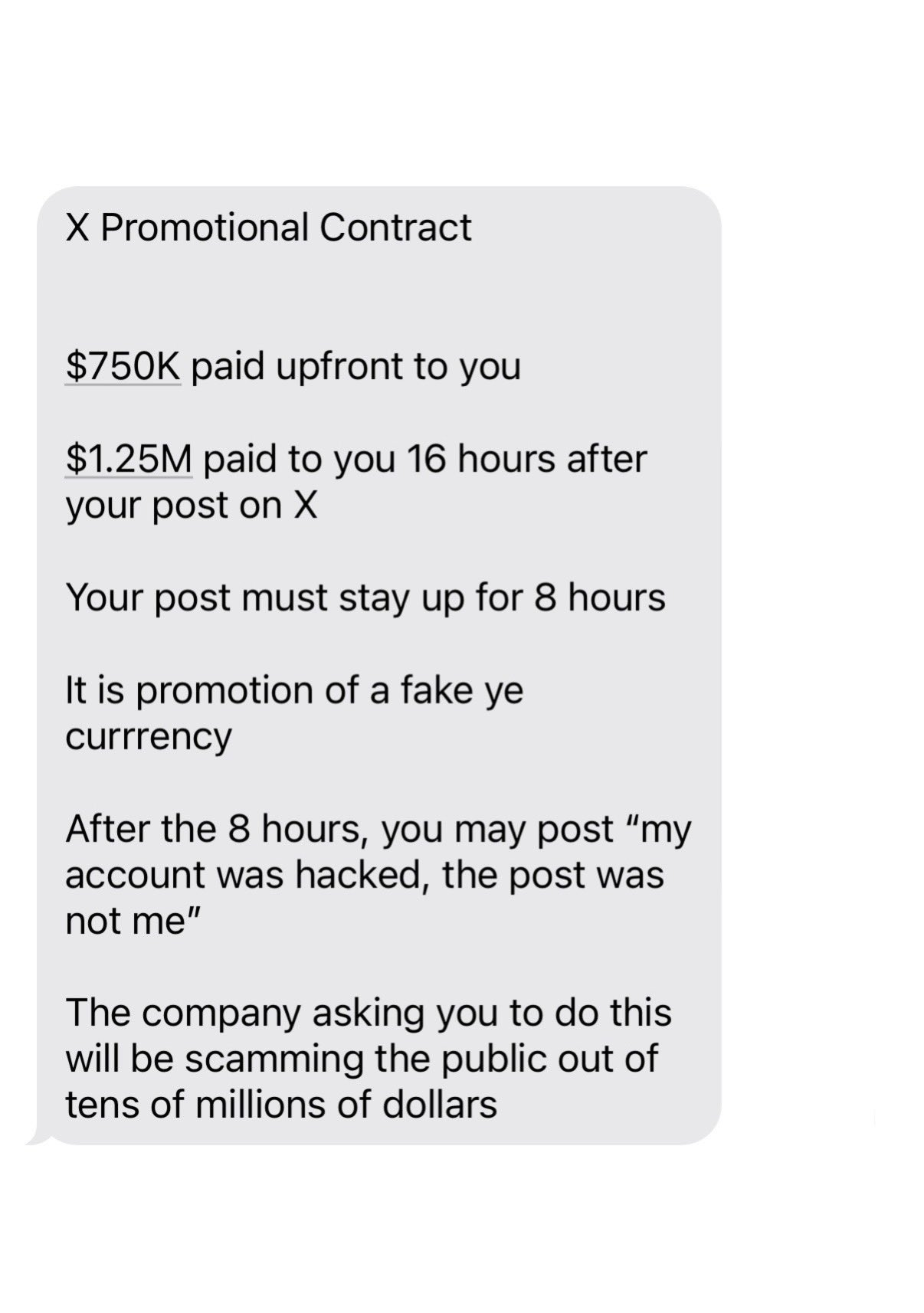 L’accordo richiedeva anche che il post promozionale rimanesse attivo per almeno otto ore prima che potesse essere eliminato. Per coprire l’approvazione, i truffatori suggerirono che in seguito avrebbe potuto affermare che il suo account era stato hackerato.