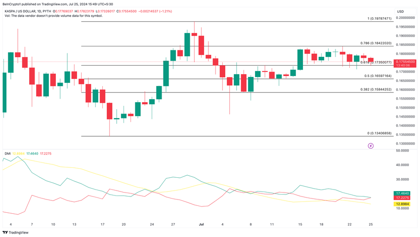 Un’ulteriore valutazione del grafico giornaliero di KAS/USD mostra la debolezza della tendenza rialzista. Questa è l’indicazione che rivela l’Indice di Movimento Direzionale (DMI). Il DMI misura semplicemente la forza e la direzione di una tendenza.
