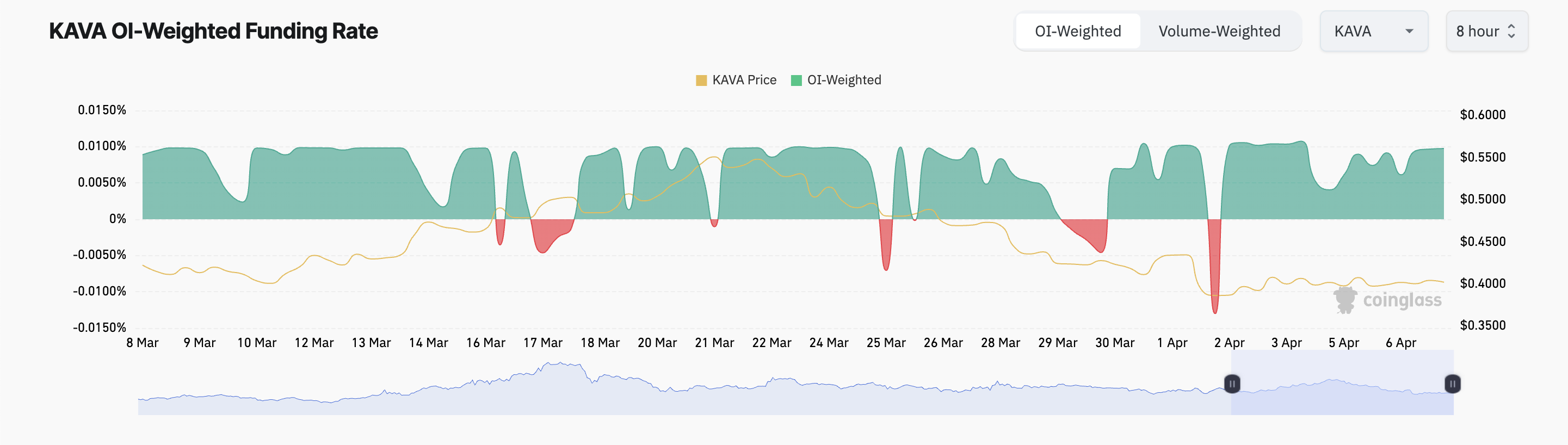 Il tasso di finanziamento è un pagamento periodico tra trader nei contratti futures perpetui per mantenere i prezzi allineati con il mercato spot. Il tasso di finanziamento positivo di KAVA significa che le posizioni long stanno pagando le posizioni short. Questa tendenza indica che più trader di KAVA stanno scommettendo su un aumento del suo prezzo.