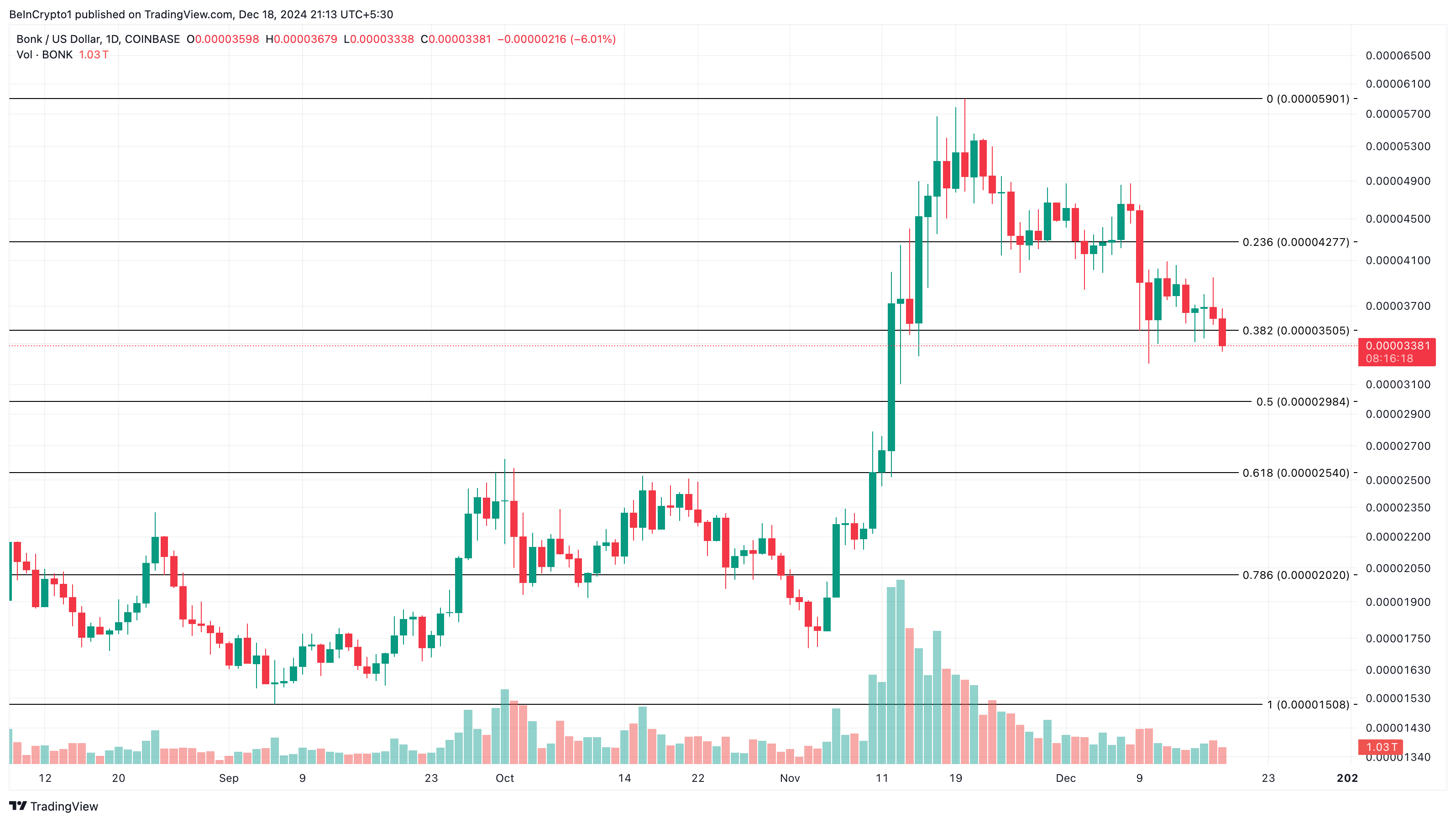 Basandosi sul grafico giornaliero, il prezzo di BONK è sceso sotto il supporto di 0,000035 USD. In precedenza, questa zona di supporto era vitale per il rimbalzo del token al suo massimo storico di novembre.