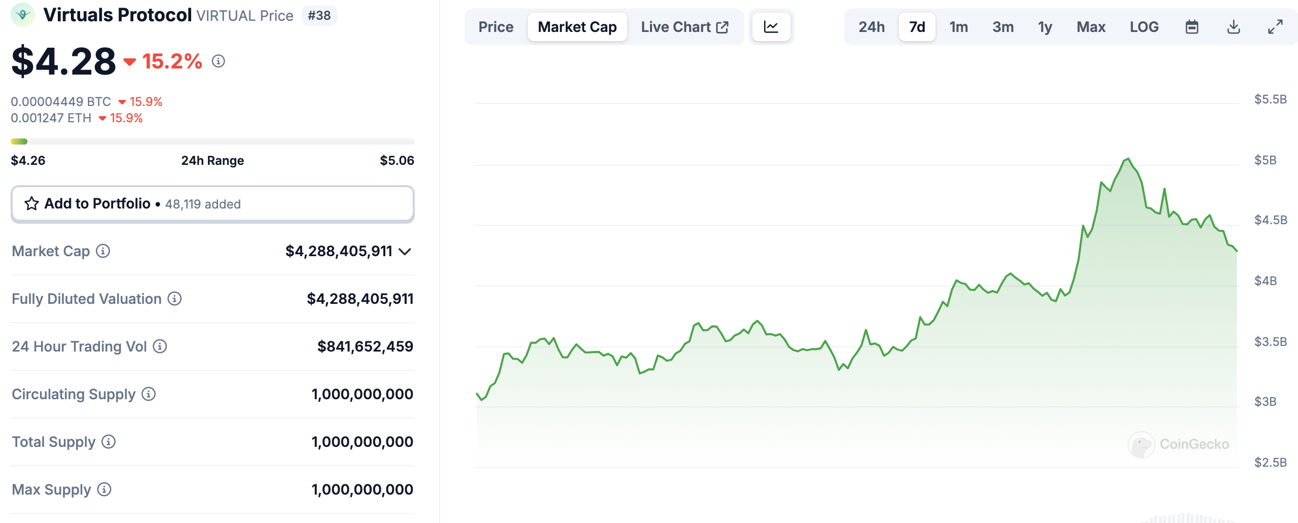 Il 1 gennaio, la capitalizzazione di mercato di Virtuals Protocol era di 3,87 miliardi USD. Ieri, è salita fino a 5,05 miliardi USD. Tuttavia, al momento della scrittura, le cose sono cambiate e la capitalizzazione di mercato di VIRTUAL è scesa a 4,28 miliardi USD.