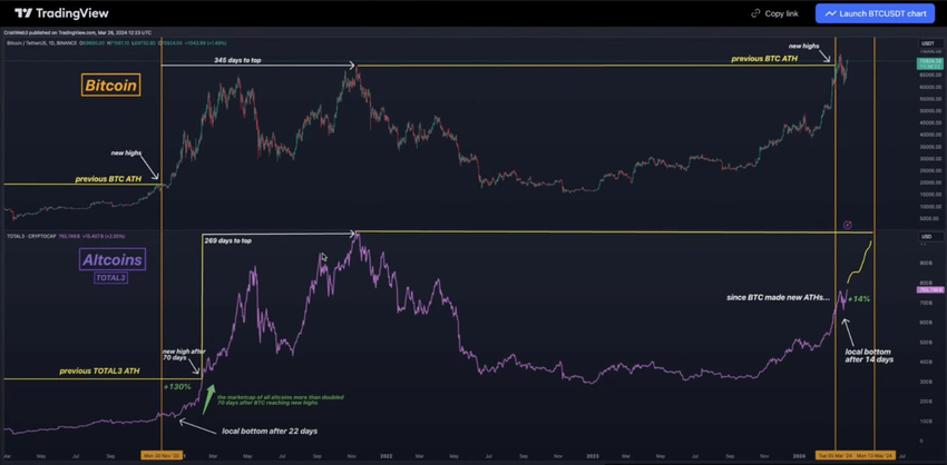 Neuner ha sottolineato che, poiché il Bitcoin ha superato il suo precedente massimo storico, anche le altcoin potrebbero raggiungere nuovi massimi circa 70 giorni dopo. Vale la pena notare che 22 giorni dopo la picca del Bitcoin, le altcoin subiscono spesso un periodo di correzione.
