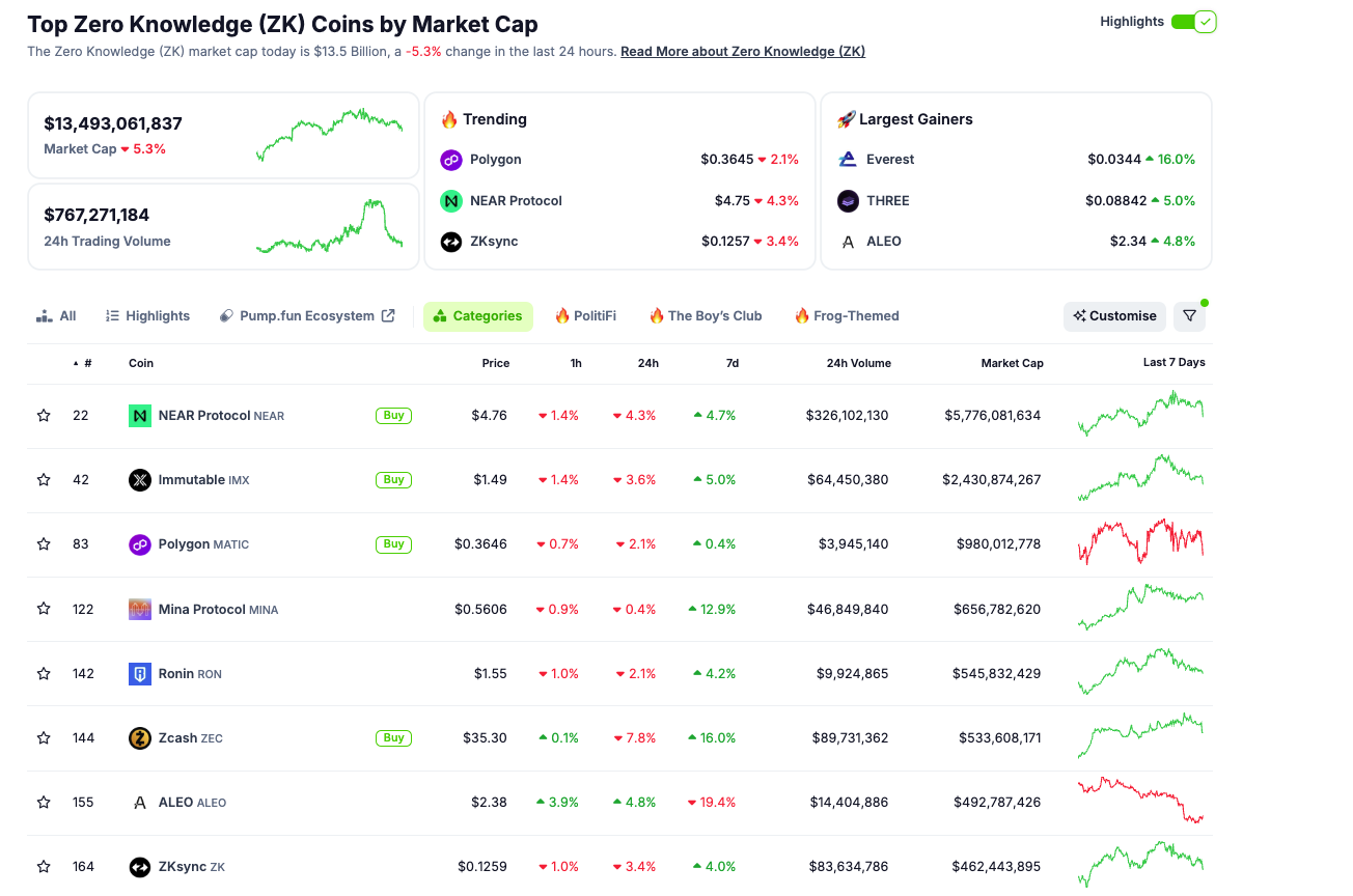 A causa dell’interesse crescente, il settore della conoscenza zero è in crescita. Secondo i dati di CoinGecko, la capitalizzazione di mercato totale delle monete a conoscenza zero è di quasi 13,5 miliardi di USD.