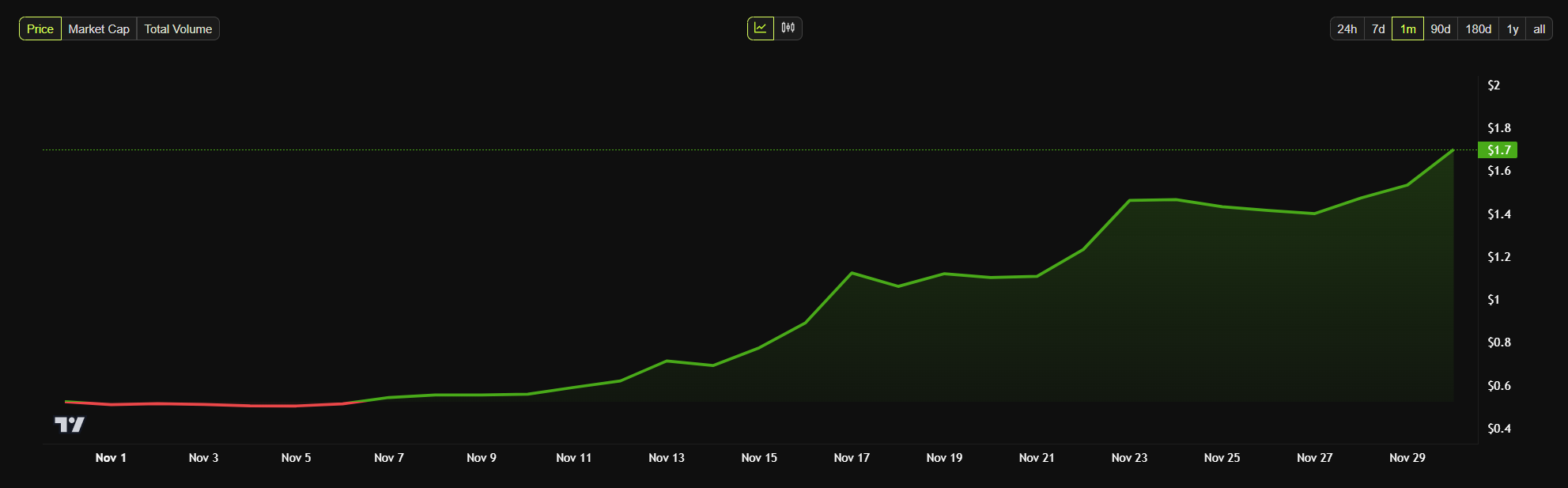 Nel complesso, novembre ha visto il valore di XRP salire di oltre il 230%. Questo è stato in gran parte guidato dalla crescente fiducia degli investitori e dal continuo slancio rialzista nel mercato.