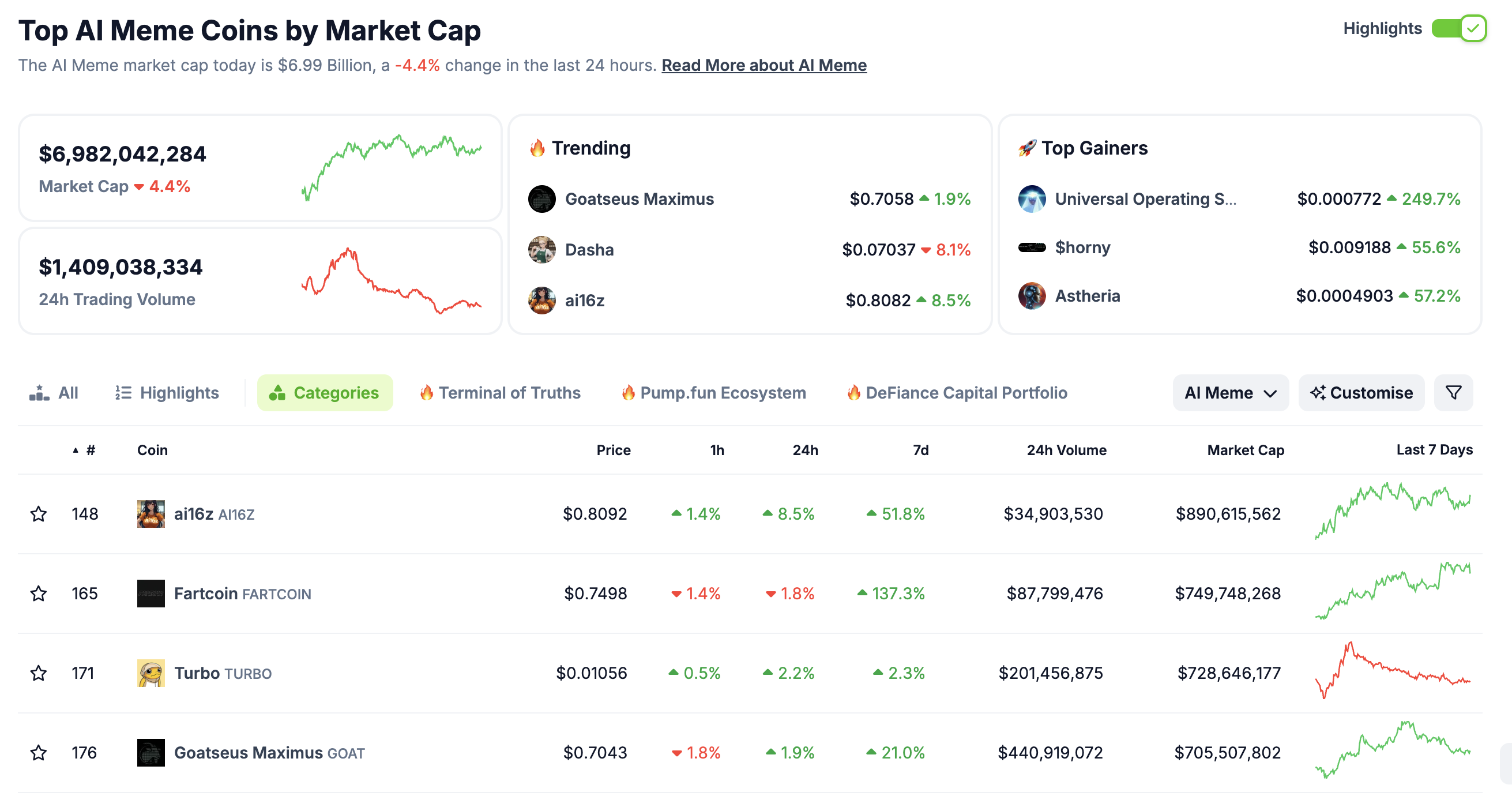 Secondo CoinGecko, il mercato delle AI memecoin è vicino a 7 miliardi USD, con TURBO che vanta una capitalizzazione di mercato di circa 728 milioni USD.