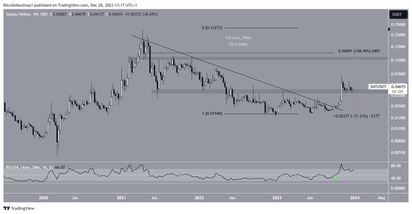 Il prezzo di SNT è sceso sotto una linea di tendenza discendente di resistenza dall ‘inizio del 2021. Il calo ha portato a un minimo di 0,018 dollari a dicembre.