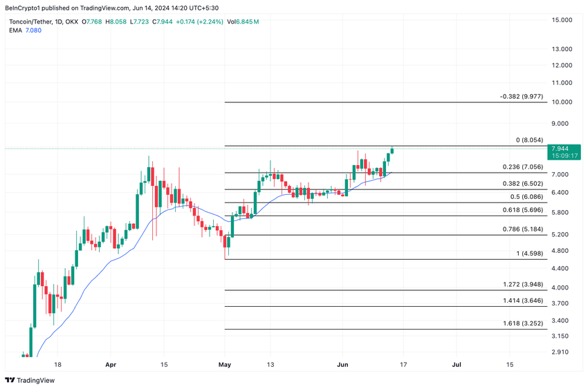 Se il sentimento rialzista continua a crescere, il prezzo di TON potrebbe rialzarsi sopra gli 8,05 dollari.