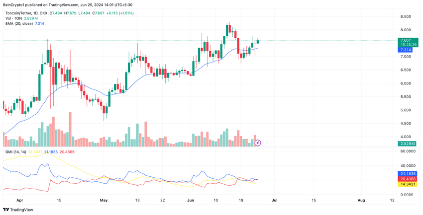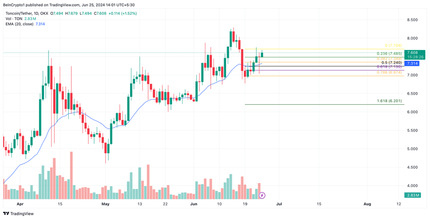 Al momento della stampa, TON scambia a 7,57 dollari. Una valutazione del rendimento del prezzo su un grafico giornaliero mostra che ha recentemente superato la media mobile esponenziale (EMA) a 20 giorni.